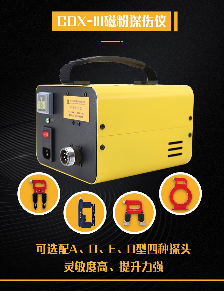 (3)E型探頭:也稱交叉磁軛探頭或旋轉(zhuǎn)磁場探頭,利用兩只交叉的磁軛采用交流電移相技術(shù),使之產(chǎn)生隨時(shí)間變化的復(fù)合旋轉(zhuǎn)磁場,可以對(duì)工件一次全方位磁化,具有探傷速度快、檢測質(zhì)量高的優(yōu)點(diǎn)。極距:80mm,提升力AC≥120N,重量:3.5kg;